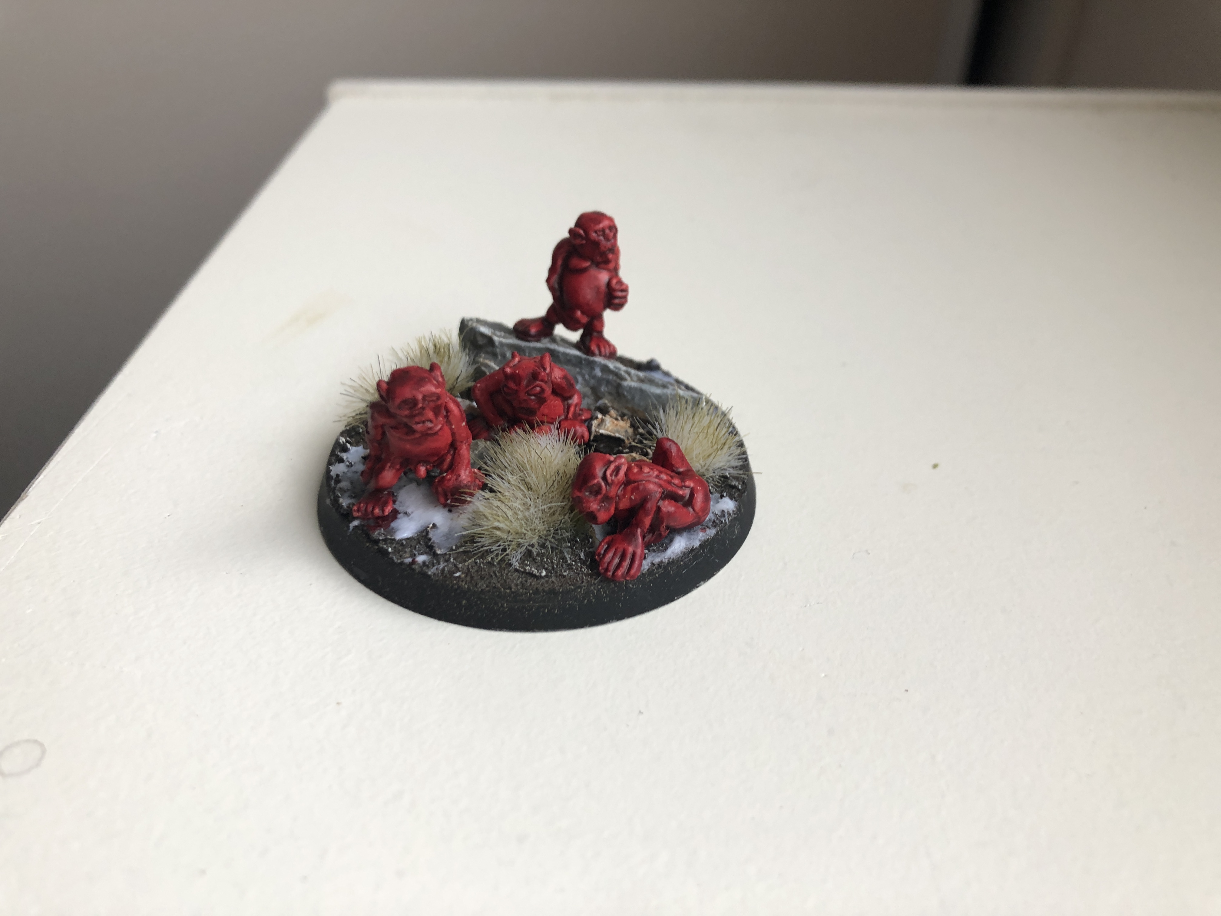 I based the swarm on a Gamer’s Grass Battle Ready Base. I these bases come ready to go with grass, rock and winter effects. The winter effect I think is a nice contrast for the read Abyssal demons. Proxy Abyssal Imp swarm ready to go! Or so I thought... I was quite proud of my first little a paint colour test and I showed them off to my gaming group. Admittedly I knew that the Mantic Vanguard miniatures were supplied with square bases, but didn’t think that it would matter if I based mine on a round base – boy was I wrong…